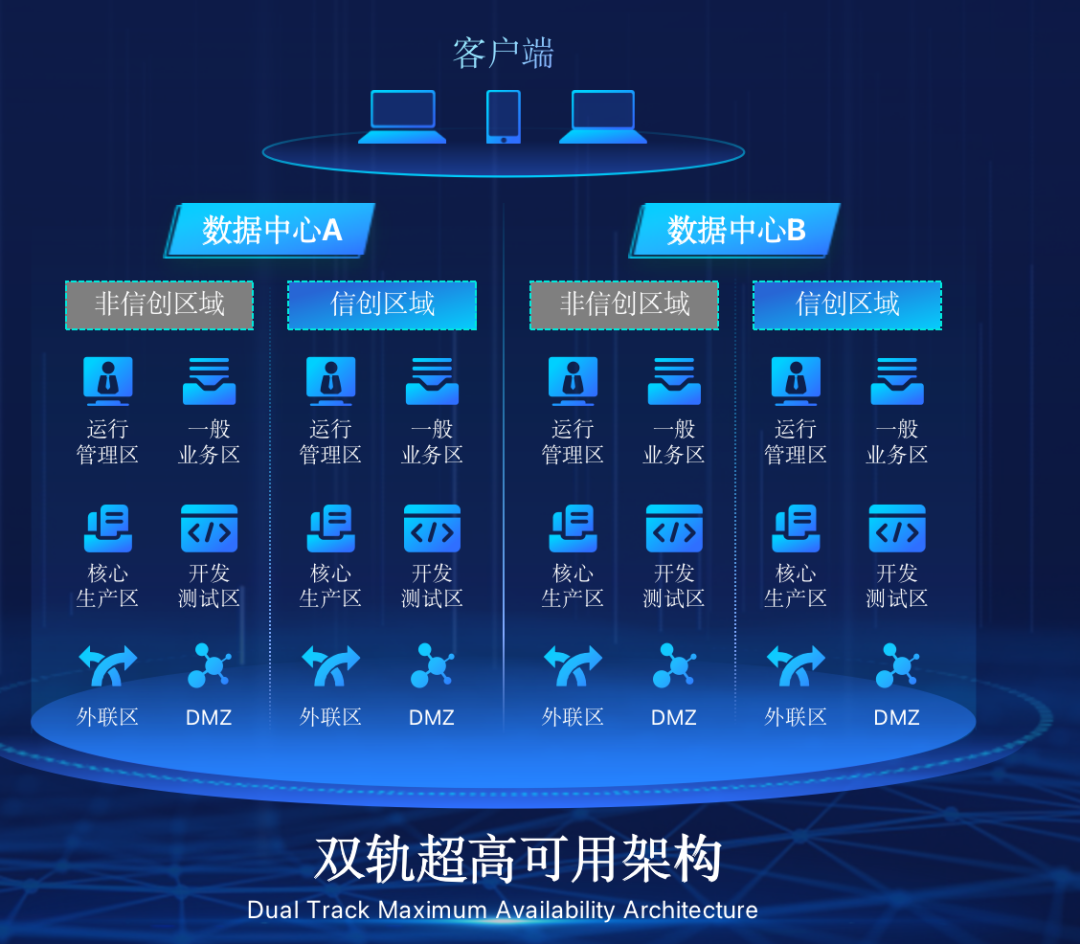 米兰电竞在企业面临自主创新IT基础重构过程中,推出的全新架构双轨超高可用架构(简称DTMAA),在双活数据中心的分区调度基础上,添加每个数据中心内信创域和非信创域的分域调度,来实现分区分域协同的多活双轨超高可用。