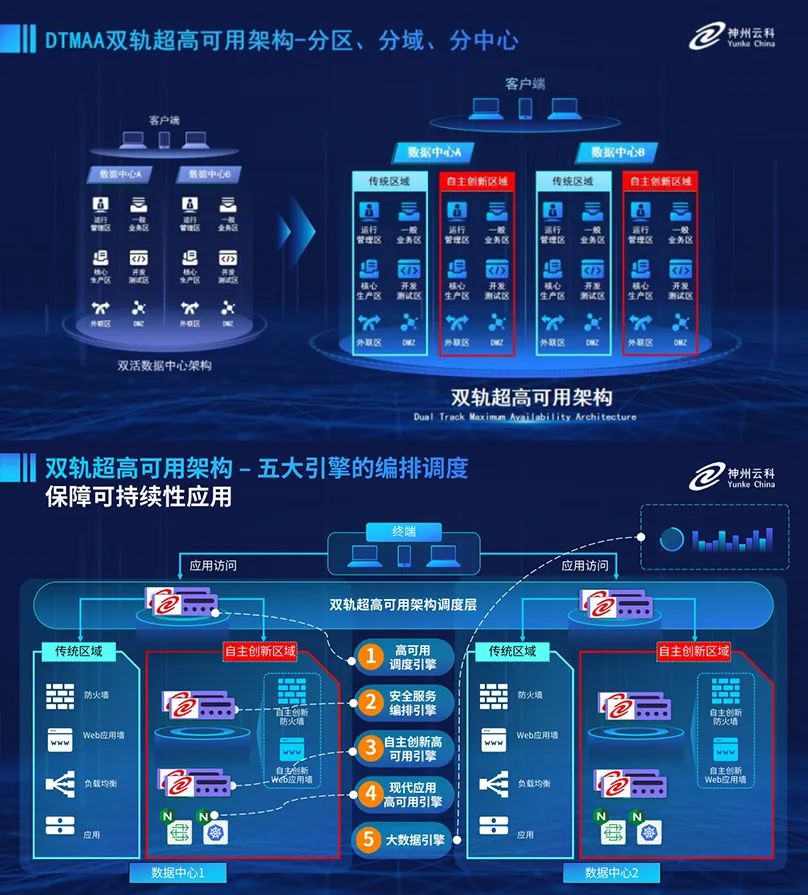 为助力银行业务高质量发展,更好地应对数字经济时代对可持续性的高要求,实现“信创”与“数字化”齐头并进,米兰电竞创新性的推出了双轨超高可用架构。该架构在双活数据中心的分区调度基础上,增加信创域和非信创域的分域调度,实行信创域与传统域应用全量部署,使双中心运营变为双中心四区域并行运行,互为多活,将“0到1”的单轨建设道路变为分区分域协同的多活双轨超高可用架构。帮助客户在新架构下,保障“信创”的同时解决性能瓶颈,提升稳定性,保证应用可持续性,最终实现信创区域和非信创区域的平滑过渡,完成国产化替代目标。